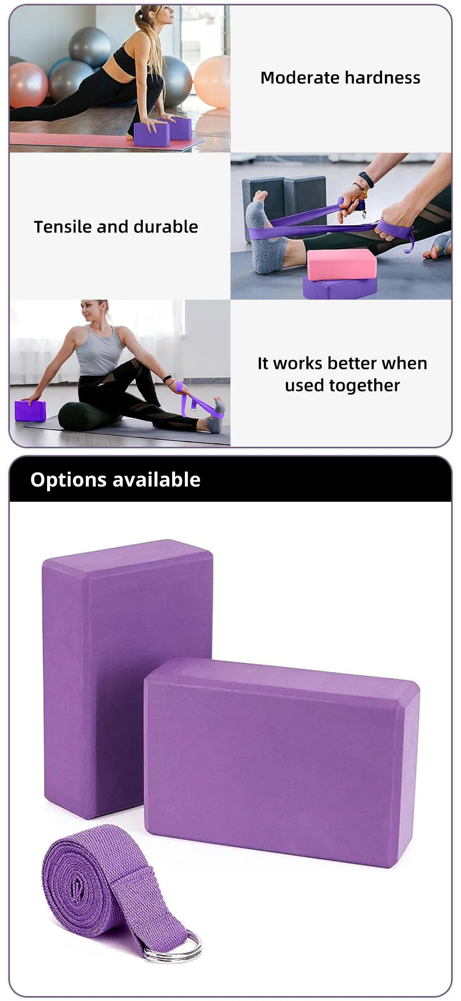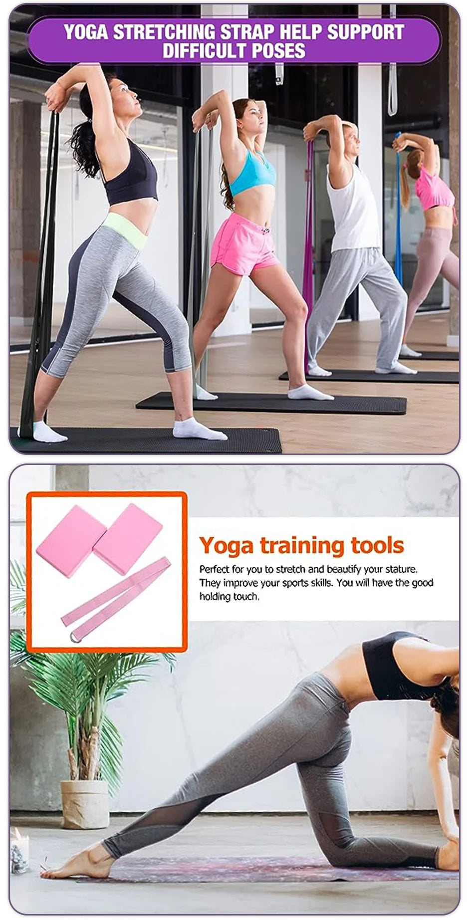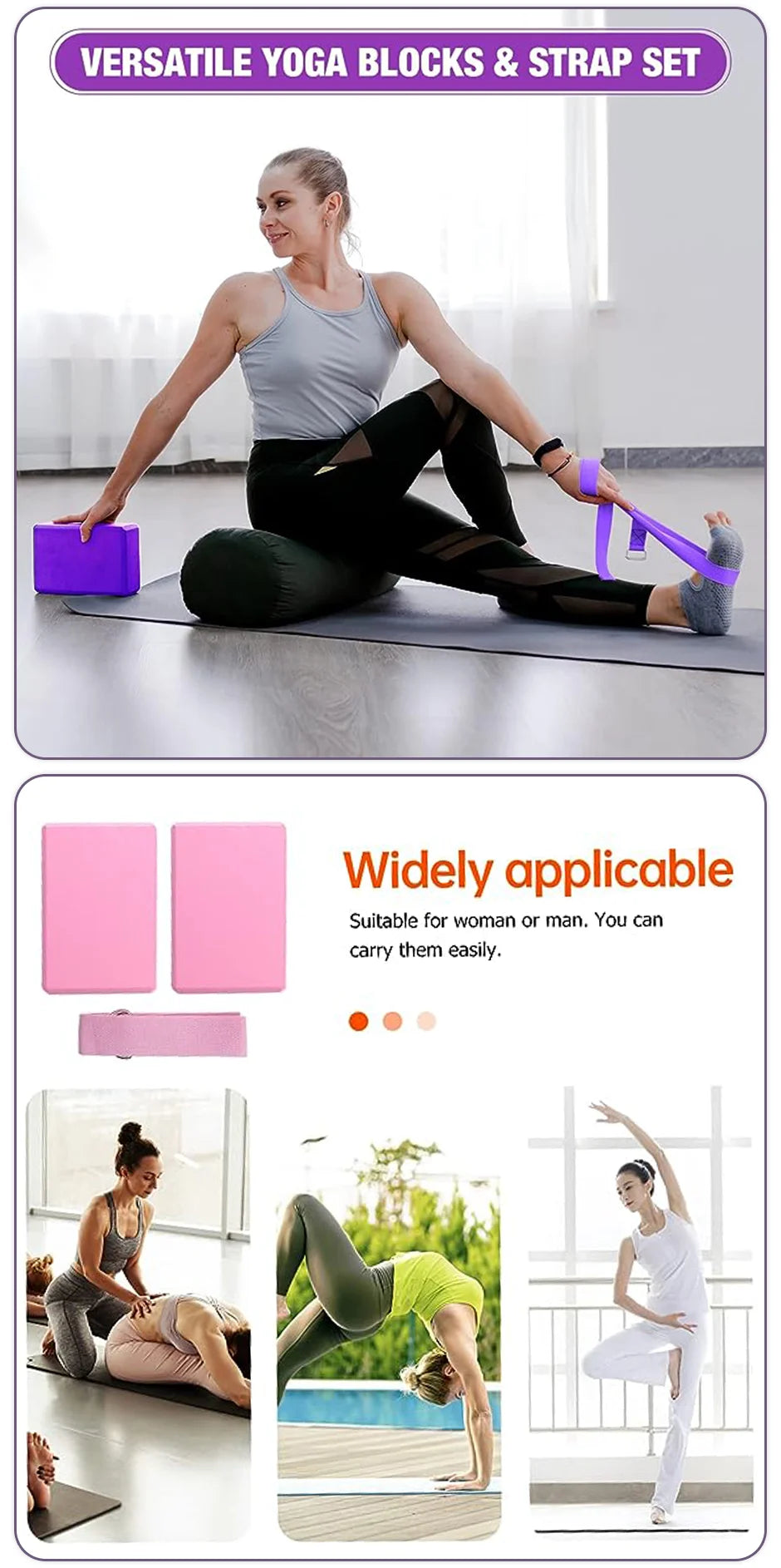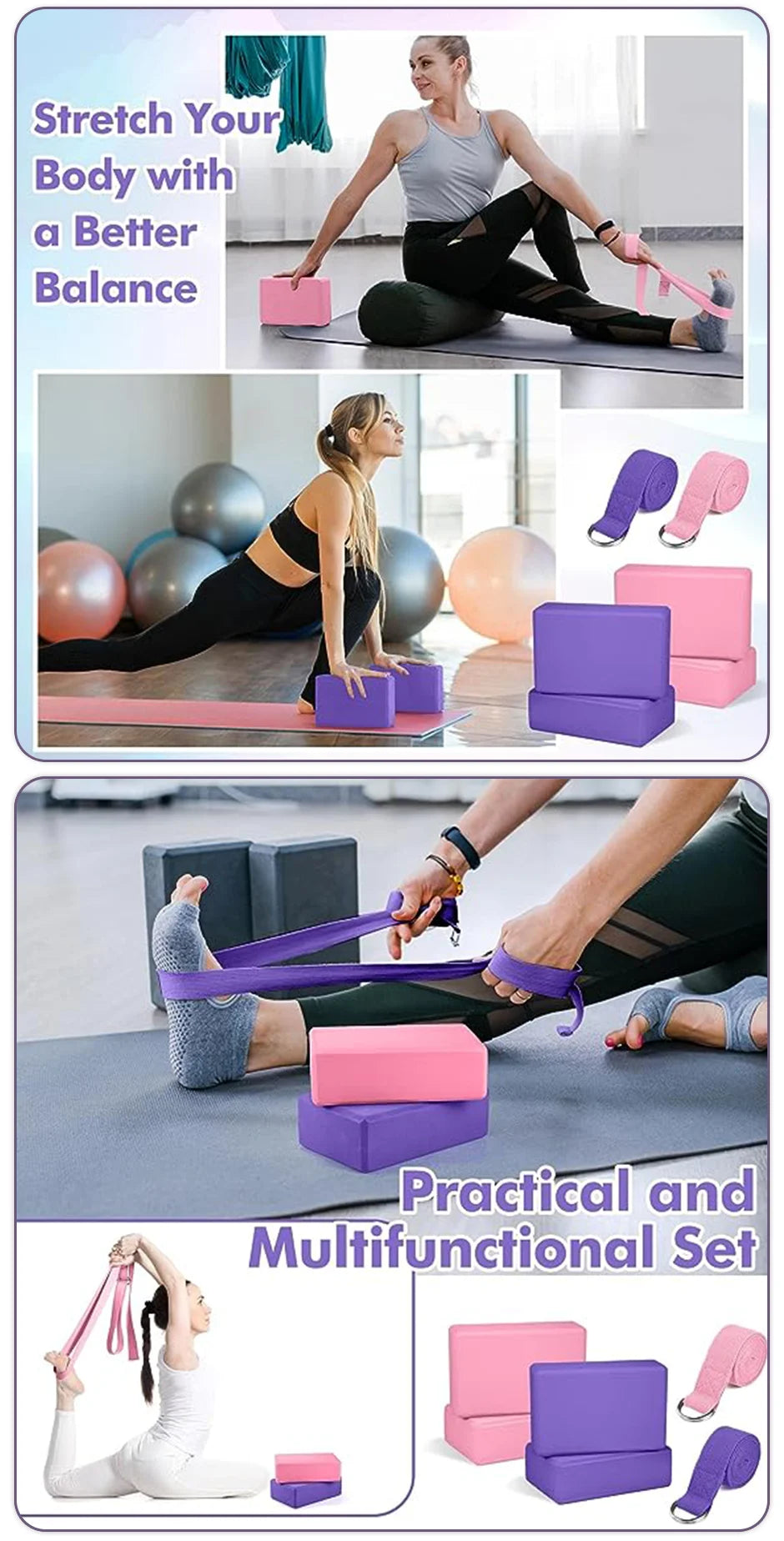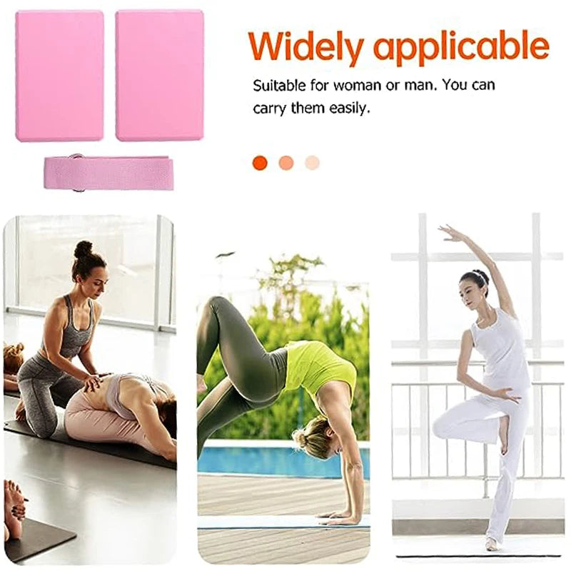 YOGA POSES: Yoga block provides the stability and balance needed in your practice to help with optimal alignment, deeper poses and increased strength. The stretching strap provides great assistance for holding the poses, and reduces the risk of pulled muscles and other injuries.
