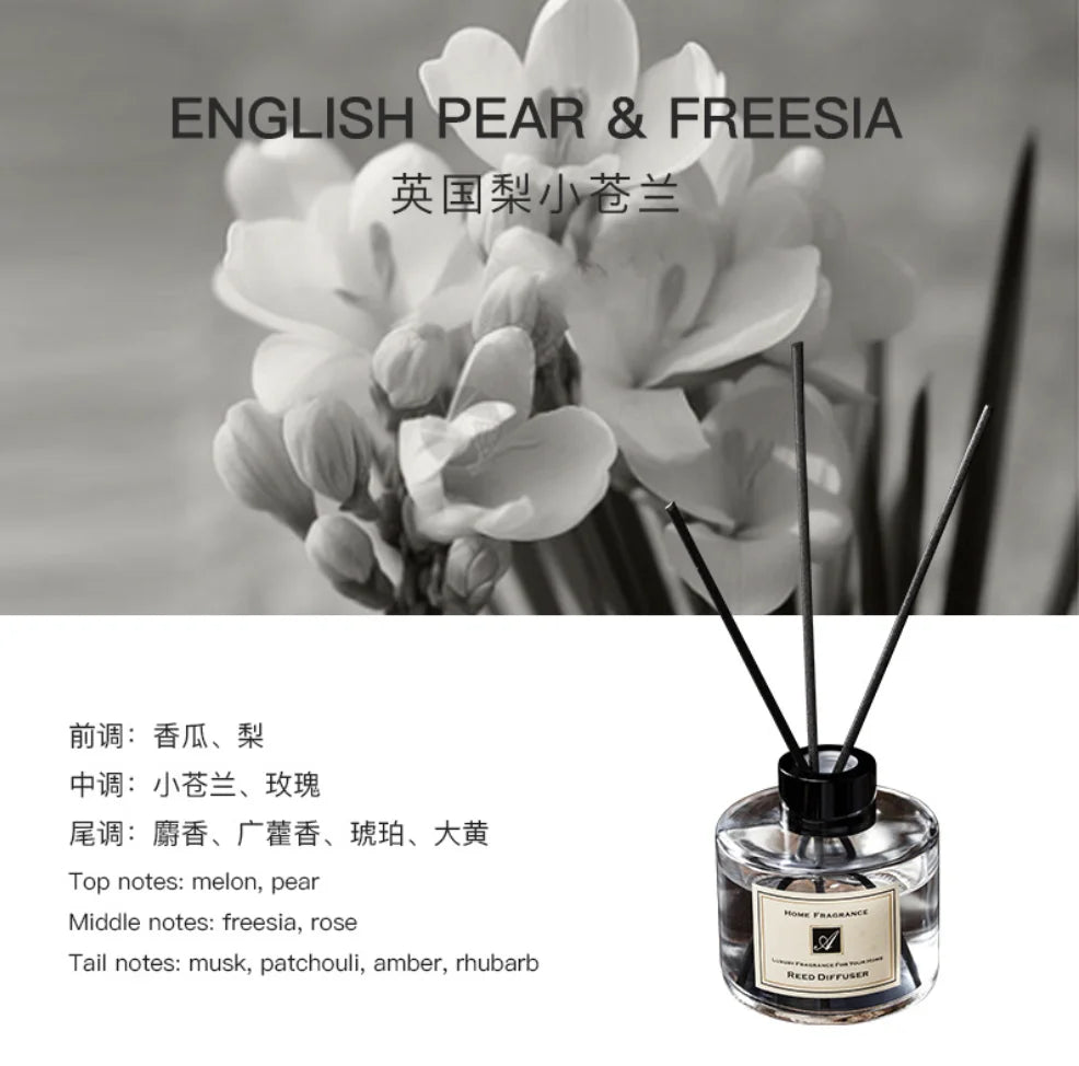 Enhance your surroundings with this elegant English Pear Aromatherapy Diffuser. Ideal for creating a pleasant atmosphere in your home, car, or hotel. This 120ml diffuser set features a luxurious Black Coco design, making it a perfect gift or addition to any decor.