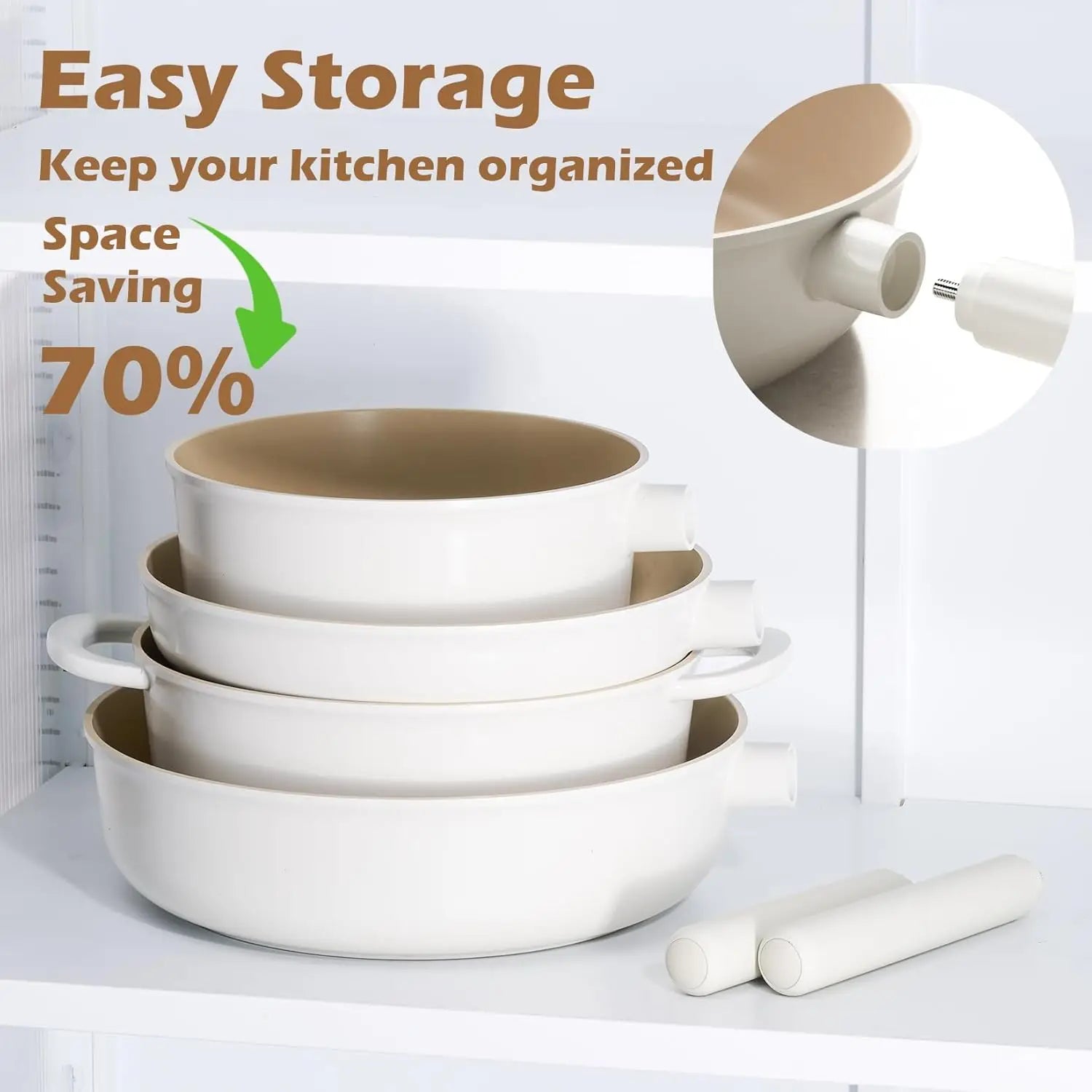 - Saving Space Design: Saving 70% of space with an easy-swivel removable handle compared to regular pans. You can easily remove the handles, neatly stack all the pots and pans, and place the pot protector between each pot to prevent scratches, then they can be easily placed in the cabinet.