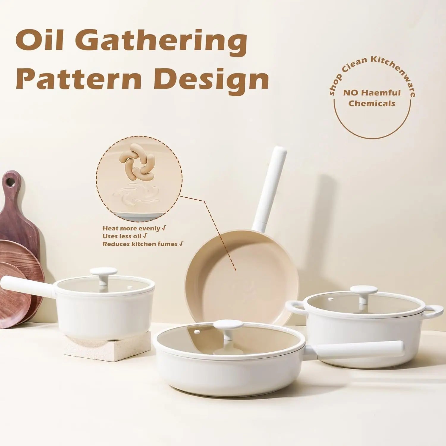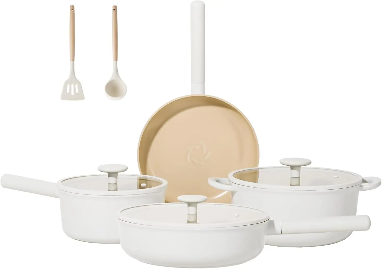 - Healthy & Safe Ceramic Cookware: Our 14pcs ceramic cookware sets use natural ceramic material, which is 100% cadmium-free, PFOA-free, PFOS-free, and Lead-Free. Our ceramic pots and pans set ensures your daily cooking is always safer and healthier.