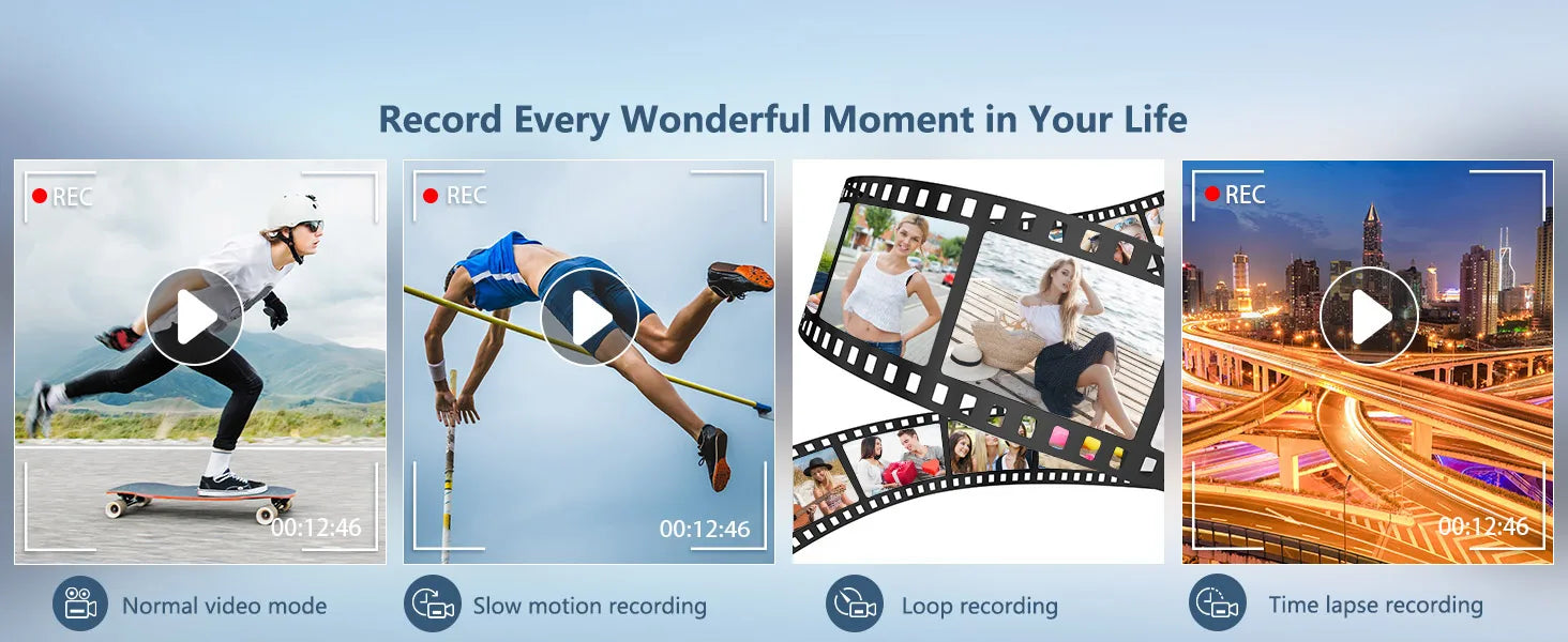- 4 Video Modes: Time-Lapse, Loop Recording, Slow Motion, Normal Video.