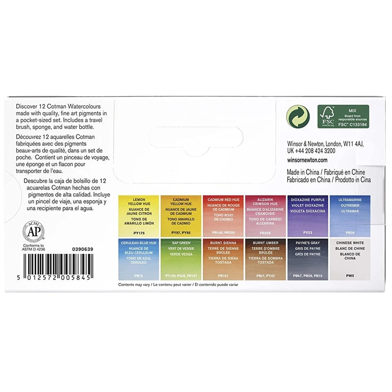 This water colour set contains 14 Cotman Water Colour half pans: Cadmium Yellow Pale Hue, Cadmium Yellow Hue, Cadmium Red Pale Hue, Alizarin Crimson Hue, Ultramarine, Cobalt Blue Hue, Viridian Hue, Sap Green, Yellow Ochre, Burnt Sienna, Burnt Umber, Chinese White.