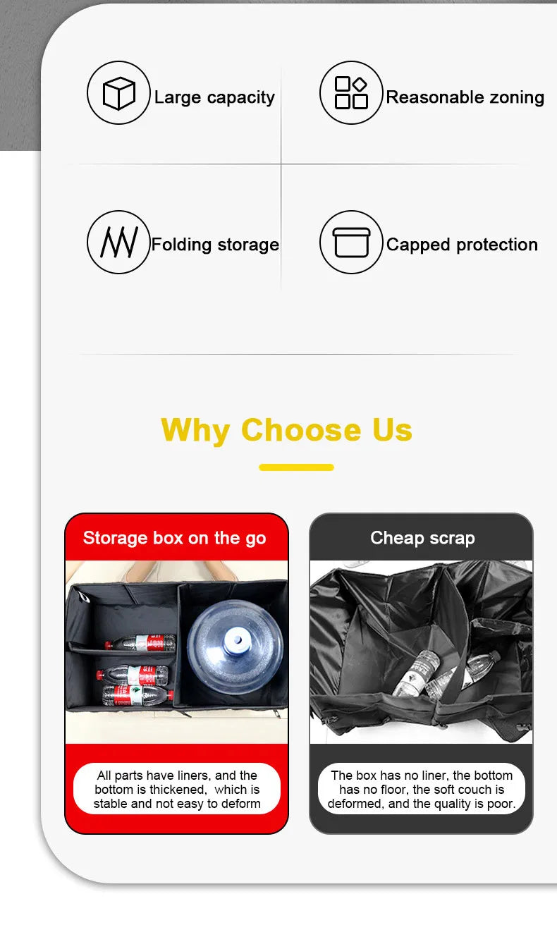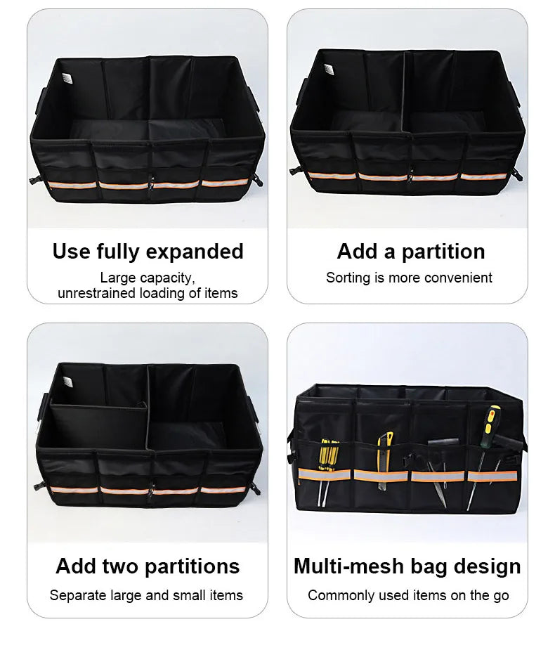 - Space-Saving Design: The foldable design allows for easy storage when not in use, taking up minimal space in your trunk. Its adjustable PP dividers ensure items are neatly organized.