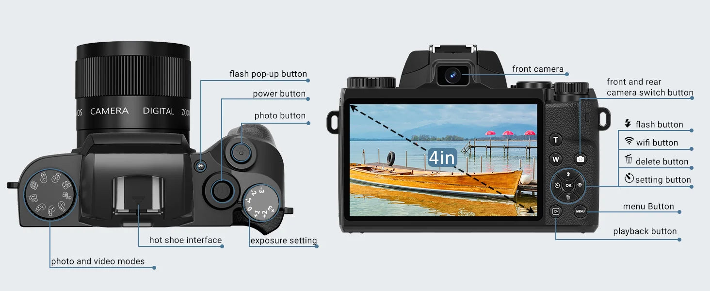 [4.0" Touch Screen & Dual-Lens camera] This camera supports 4.0-inch touch screen. Equipped with dual lens, easy switching to front camera, you can see what you are recording or the picture framing while doing self blogging