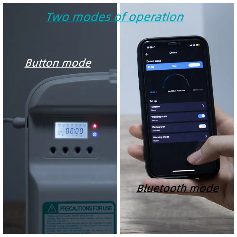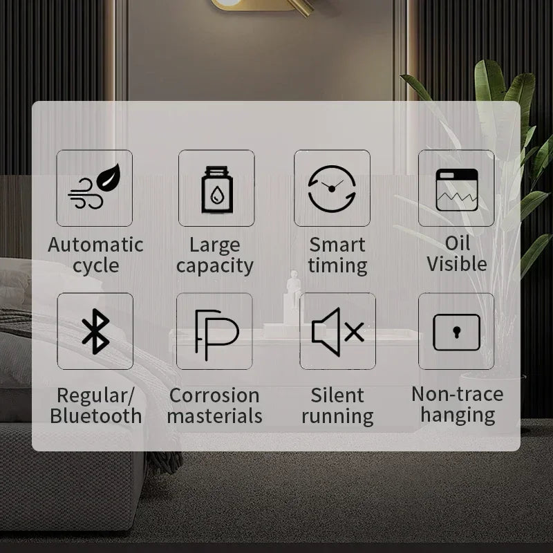 Enjoy effortless control with Bluetooth connectivity via a dedicated app. Set working hours, adjust atomization duration, and monitor residual oil levels directly from your smartphone—making maintenance and customization simple and convenient. The diffuser supports both flat and wall-mounted installation, providing versatile placement options to suit your décor and space requirements.
